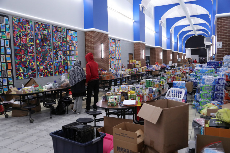 Американцы собирают пожертвования. На следующем фото продукты первой необходимости, собранные в холле средней школы Южного Уоррена в ночь после обстрела торнадо Боулинг-Грин