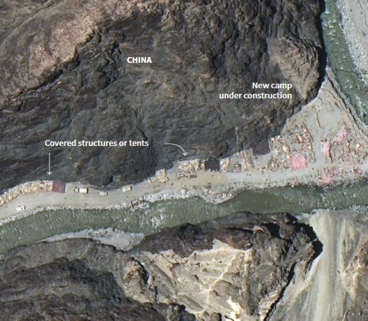 Фортификации армии Китая включают замаскированные палатки или крытые сооружения у подножия скал, а на небольшом расстоянии – вероятно, новый лагерь со стенами и баррикадами. Его не было видно на фотографиях, сделанных спутником на минувшей неделе.