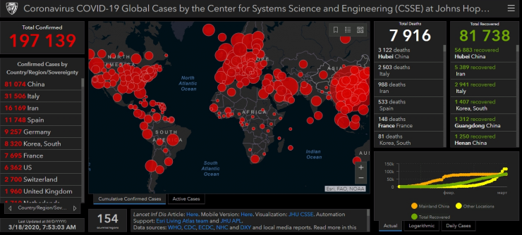 По данным на утро 18 марта, COVID-19 выявлен в 154 государствах, общее число заболевших составило 197 139, летальных исходов 7916, выздоровели 81 738 человек. Отмечается, что за последние сутки вирус обнаружен в восьми новых странах.