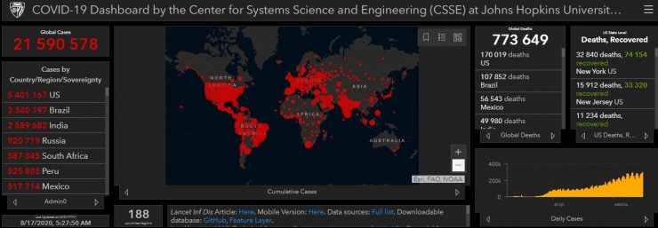 По данным университета, в мире COVID-19 заболели 21 590 578 человек, жертвами инфекции стали 773 649 пациентов, еще 13 593 678 человек выздоровели.