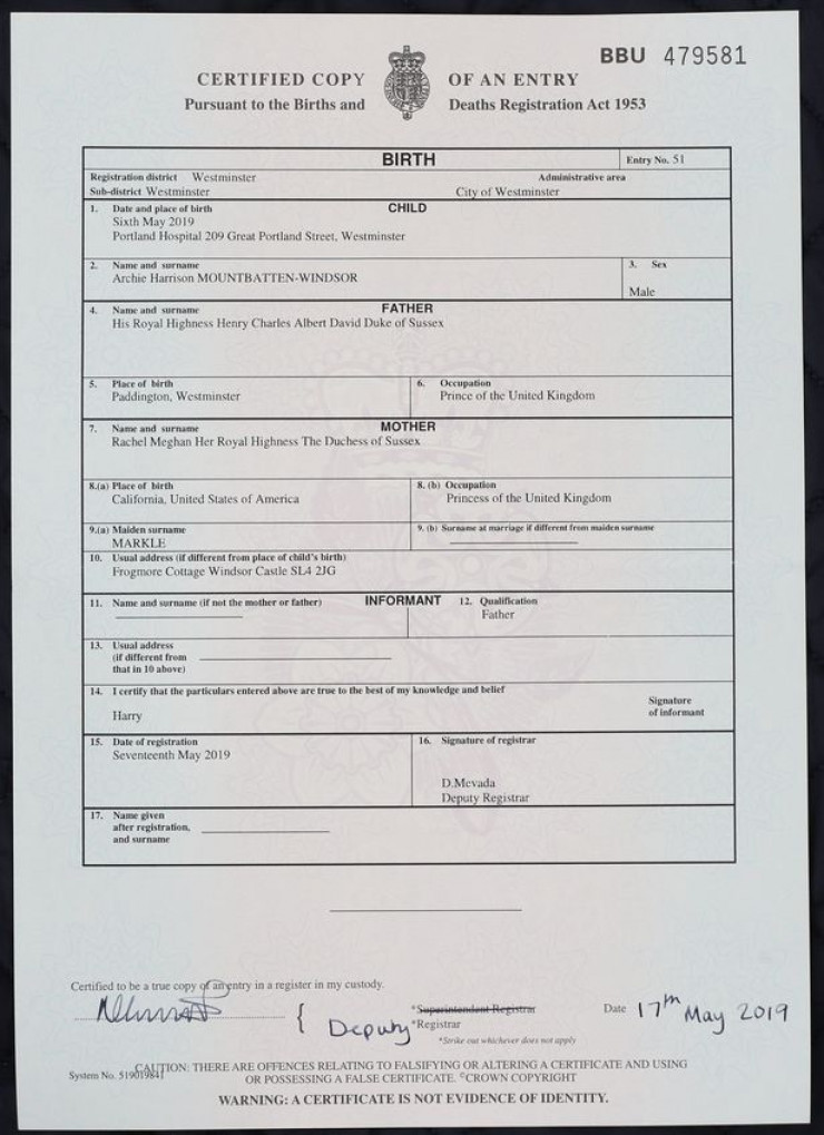 Опубликованный документ также раскрыл место рождения Арчи. Ребенок появился на свет в частной больнице Portland Hospital в Вестминстере, пребывание в которой, по данным издания, могло обойтись в 25 тысяч долларов.