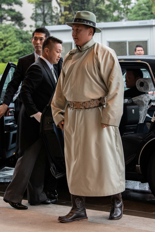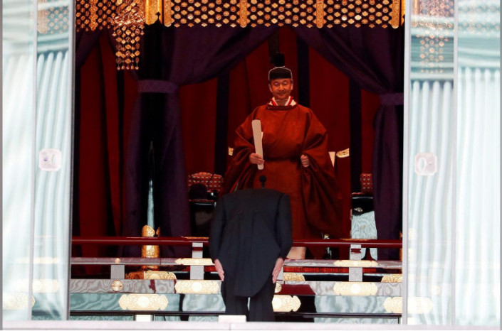 Новый император Нарухито стал монархом 1 мая после того, как накануне его отец – ныне Почетный император Японии Акихито - отрекся от престола в связи с преклонным возрастом. Тогда ему были символически переданы императорские регалии - меч Кусанаги-но-цуруги, яшма магатама, а также Императорская печать и печать Государства Япония. Императорские регалии находились у трона во время церемонии провозглашения.