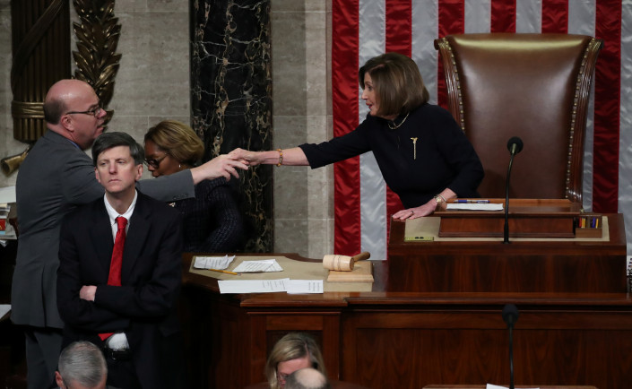 Спикер палаты представителей Нэнси Пелоси обменивается рукопожатием с председателем комитета Джимом Макговерном во время голосования за импичмент президенту США Дональду Трампу. © Reuters