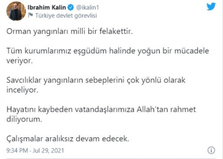 О трагедии Ибрагим Калын высказался в своем Twitter-аккаунте.