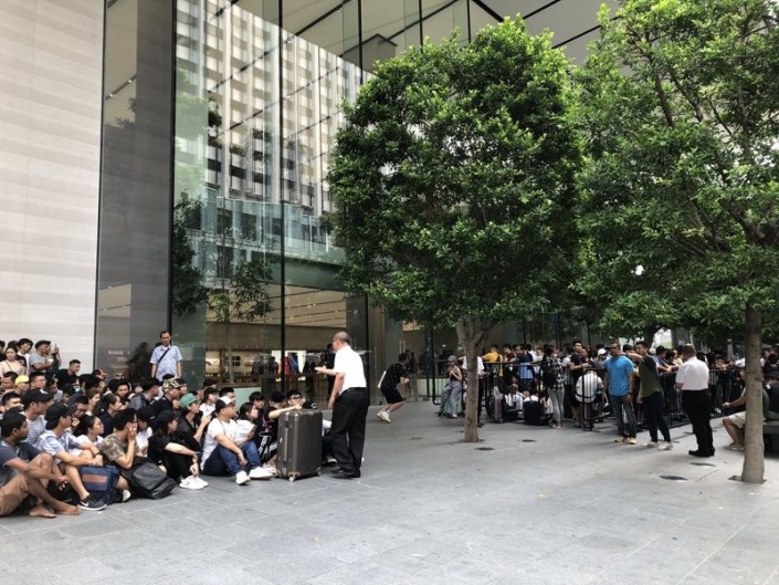 Возле магазина в Сингапуре в очереди стоят сотни людей, желающие купить новый телефон.