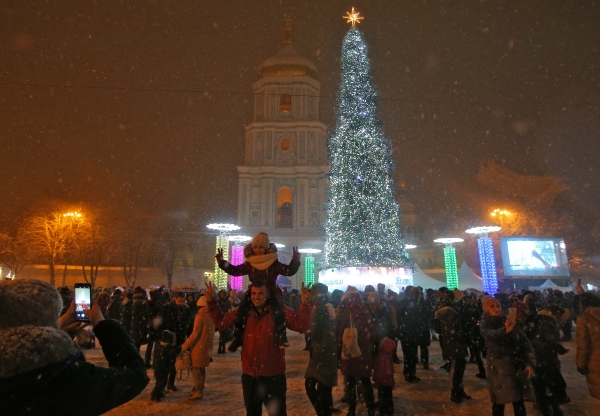 Массовые гуляния проходят в это Рождество и в центре Киева. Люди собираются возле главной елки на Софийской площади.