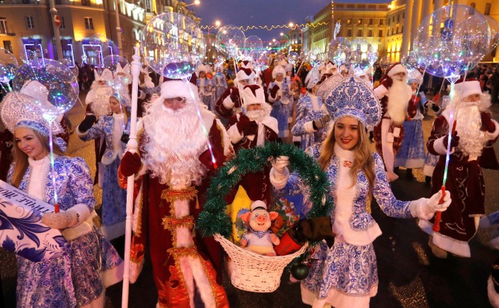 В столице Беларуси для тысяч минчан 24 декабря прошло шествие Дедов Морозов и Снегурочек. В праздничном параде приняли участие несколько сотен жителей, одетых в костюмы сказочных героев.