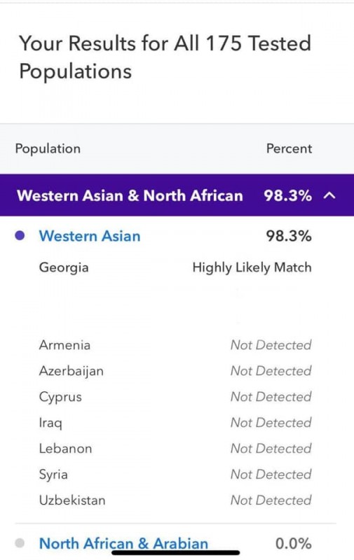 "Почти на 99 процентов я оказался грузином и на один процент - греком. Этот тест точно определяет принадлежность твоих предков как минимум за последнюю тысячу лет. Не оказалось ни одной капли от другого населения региона. В соответствии с этим исследованием, Иран и Турция связаны с Грузией, из-за того что в двух этих странах исторически много грузин. Выяснилось, что в течение многих веков мои предки вообще ни с кем не были смешаны, и я первым нарушил эту традицию, женившись на европейке", - написал политик.