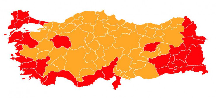 Распределение голосов во втором туре выборов в Турции. Красный цвет - за Кылычдароглу, желтый - за Эрдогана.