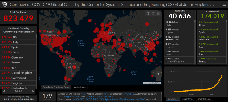 На данный час в мире зарегистрировано более 823 тысячи заражений COVID-19. Больше всего больных в США - 175 тысяч человек. На втором месте Италия - 105,7 тысячи заражений. В Испании более 94 тысяч заболевших.