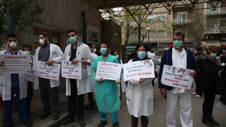 Грекиялық дәрігерлер шеруді Дүниежүзілік денсаулық күніне арнаған. Маска мен қорғаныс костюмдерін киген дәрігерлер үлкен ауруханалардың кіреберісіне жиналған. Плакаттарында "Сіздер үшін күресіп жатырмыз, біз үшін қаттырақ қолдау көрсетіңіздер" деп жазылған.