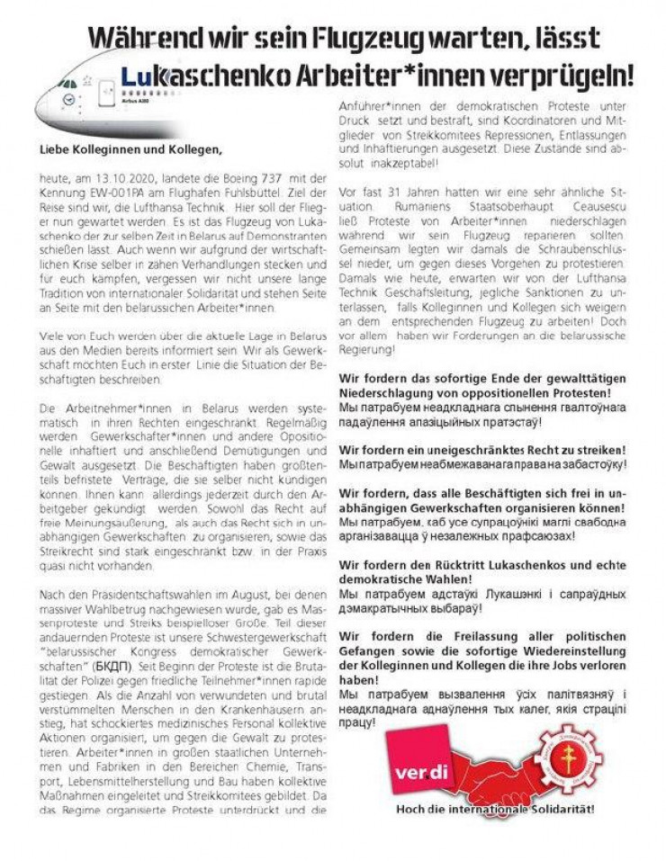 "Мы, профсоюзные активисты компании Lufthansa Technik, не забываем нашу давнюю традицию международной солидарности и стоим бок о бок с белорусскими рабочими", - говорится в листовке профсоюза компании.