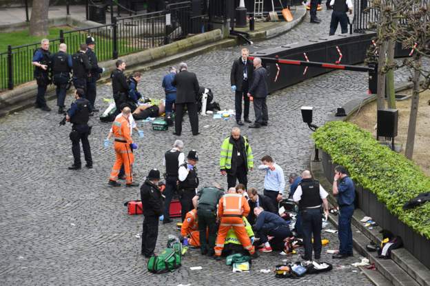 Лидер палаты общин Дэвид Лидингтон заявил парламентариям, что неизвестный ранил ножом полицейского, после чего был ранен полицией. Также сообщается, что на расположенном рядом с парламентом Вестминстерском мосту машина сбила нескольких человек.