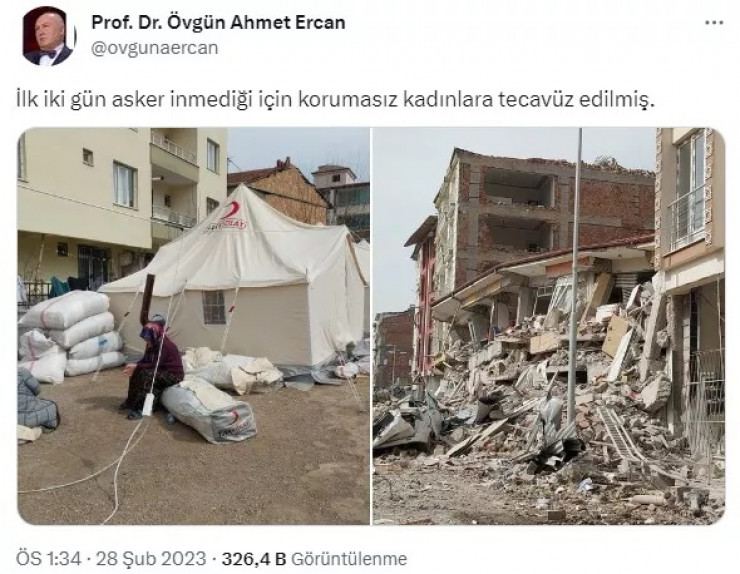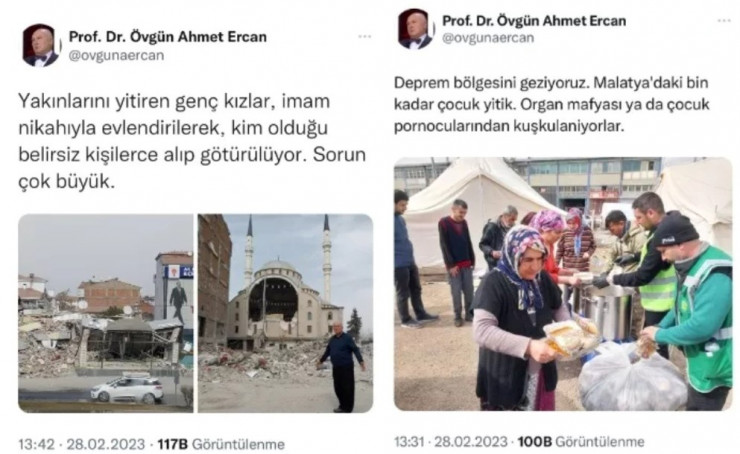 По данным телеканала, Эрджен публиковал в Twitter не соответствующие действительности сообщения. Например, в одном из постов профессор написал, что в разрушенном землетрясениями Кахраманмараше женщины подвергались изнасилованиям из-за позднего прибытия солдат - через два дня после катаклизма.
