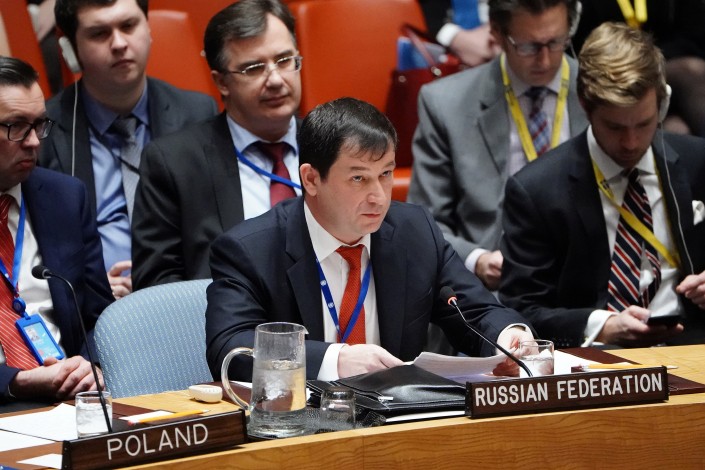 Исполняющий обязанности постоянного представителя Российской Федерации при ООН Дмитрий Полянский заявил, что "25 ноября три корабля ВМС Украины незаконно пересекли российскую государственную границу, взяли курс на Керченский пролив, не реагировали на законные требования кораблей и катеров погранслужбы ФСБ России и Черноморского флота России, проводили опасное маневрирование, создавая угрозу для нормального движения судов по акватории".