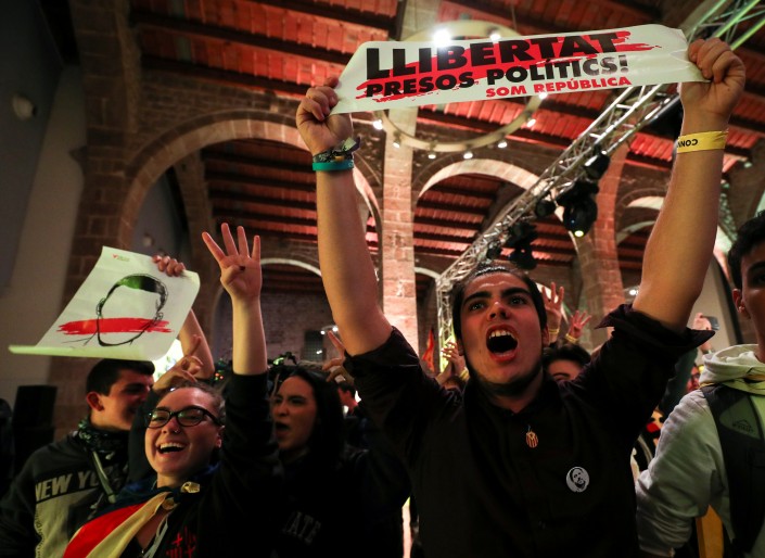 Сторонники центристской партии "Граждане", поддерживающей единство Испании, празднуют первое место на выборах в парламент Каталонии, сообщает РИА Новости.