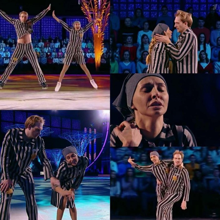 На протяжении номера артисты выделывают пируэты на льду, при этом периодически улыбаются, получают аплодисменты публики. И максимальные баллы от жюри. Оба участника при этом одеты в полосатые робы с нашитыми желтыми звездами Давида.