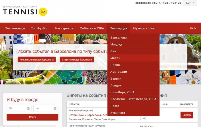 Удобством сайта является раздел "Топ-города", где можно увидеть список матчей и мероприятий в том или ином месте. На странице вы можете выбрать интервал дат, а сервис покажет все события, доступные в это время.