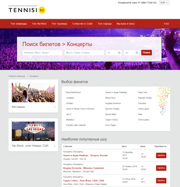 На tennisi.tickets-partners.com есть билеты не только на спортивные события, но и на концерты и музыкальные фестивали во многих городах мира - они вынесены в специальный раздел "Музыка и шоу". Прямо сейчас можно приобрести билеты и запланировать посещение концерта Jay-Z, Леди Гаги, Gorillaz, Элтона Джона, Селин Дион и других исполнителей.