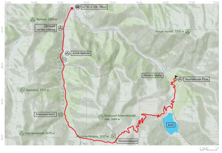 Описание: "Альпийская роза" - Большое Алматинское озеро - перевал Жусалы-Кезень - ущелье Проходное - "Алешкин мост" - санаторий "Алма-Арасан" - ГЭС-2