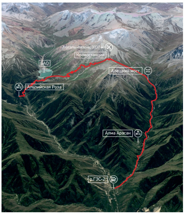 Поднявшись к озеру, идем по дороге на запад, мимо домиков снеголавинной станции. От озера до седловины перевала Жусалы-Кезень, 3337 м (43.04090, 76.94060), около 8 км. Дорога идет серпантином и приводит к зданиям Высокогорной станции космических лучей Института физики высоких энергий НАН РК.