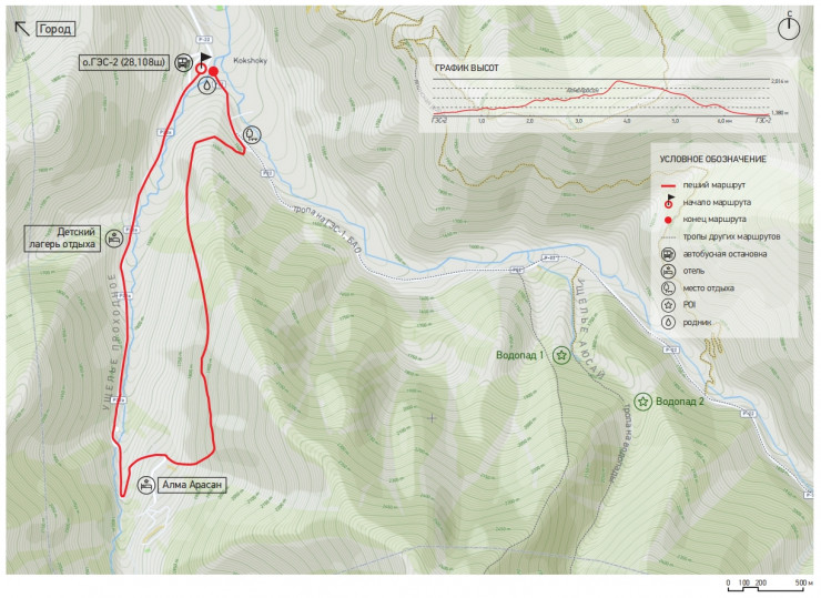 Это прогулочный поход, он займет у вас 4,5-5 часов. На автобусе можно доехать до ГЭС-2, конечная остановки автобуса №28 и пройти по дороге до курорта "Алма-Арасан", мимо детских лагерей отдыха. Это займет 1,5 часа. Можно доехать на автомобиле до поворота дороги на бывший курорт "Алма-Арасан". Здесь надо уходить на тропу, идущую вдоль русла реки, которая приведет к открытому выбросу минерализованной горячей воды. От источника нужно подняться на верхнюю тропу к водопадам. Обратно спуск по руслу к дороге, ведущей к бывшему санаторию. Подняться к первым домам поселка и сойти с дороги на тропу, возле местного кладбища, идущую строго в северном направлении по склону хребта, являющегося водоразделом между реками Большая Алматинка и Проходная. Тропа постепенно выведет на гребень хребта через красивый смешанный лес и через 1,5 часа приведет к спуску немного выше остановки ГЭС-2.