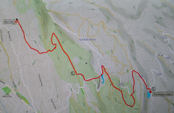 Маршрут на озеро Юннатское начинается от конечной остановки 95, 99 маршрутов, расположенной на парковке перед горой Кок-Тобе. От конечной остановки необходимо начать движение по улице Омарова в южном направлении. Через 400 метров на развилке держаться левой стороны. Далее двигаемся 1-1,2 км, после мы подойдем к невысокому холму. Пройдя еще 200 метров, необходимо повернуть налево и, двигаясь по явно выраженной тропе по спирали, взойти на холм. По центру холма идет дорога, по которой необходимо двигаться 1-1,2 км, после чего будет спуск налево и вниз к асфальтированной дороге. Спускаемся вниз и двигаемся до улицы Ондасынова, по которой продолжаем путь вниз и на восток. В районе газовой трубы есть возможность срезать путь. Идем до Конного центра. Сразу же после Конного центра поворачиваем с асфальта направо на гравийную дорогу, которая идет через кладбище и плавно поворачивает вправо и вверх. Идем по центру гребня. Дорога постепенно будет поворачивать влево и спускаться вниз. По ней доходим до озера Юннатское.