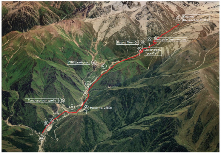 Пройдя альпинистский лагерь тропа медленно набирает высоту по дороге вы увидите бастионы Туюксу, вершины Октябренка и Йшкар-Олы. Далее, траверсируя вдоль склона через 2,8 км, вы дойдете до метеостанции на плотине Мынжилки.