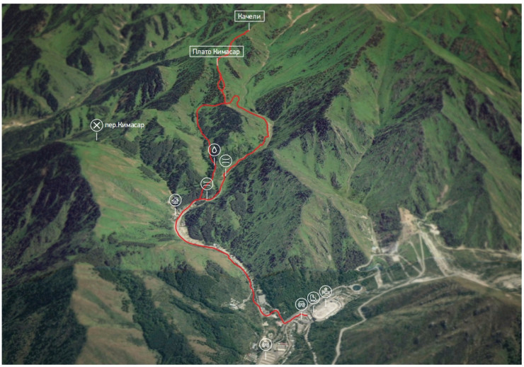 Асфальтная дорога с небольшим подъемом уходит на восток и идет вдоль терренкура реки Кимасар. Через полтора километра дорога сворачивает на юг. Асфальт заканчивается, дорога становится грунтовой, переходит на левый берег реки, в затем, через 300 м по второму мосту возвращается на правый берег.