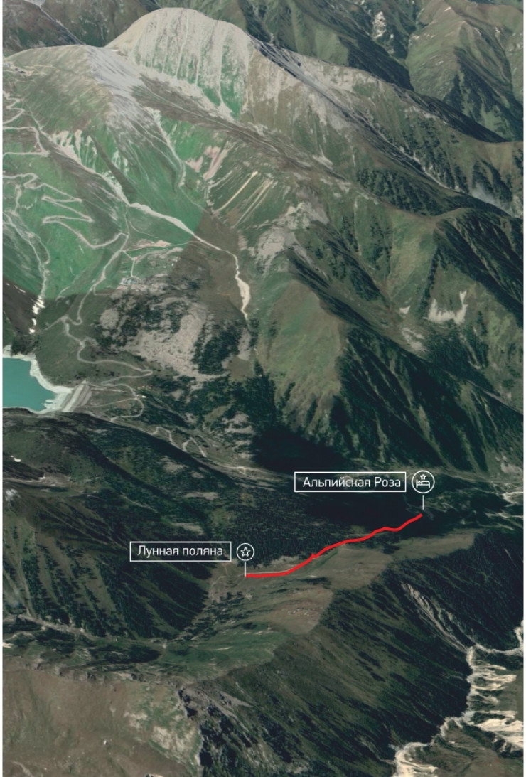 Отель "Альпийская роза" (43.07439, 76.98948) расположен в верхней части автомобильной дороги, ведущей на Большое Алматинское озеро (БАО).